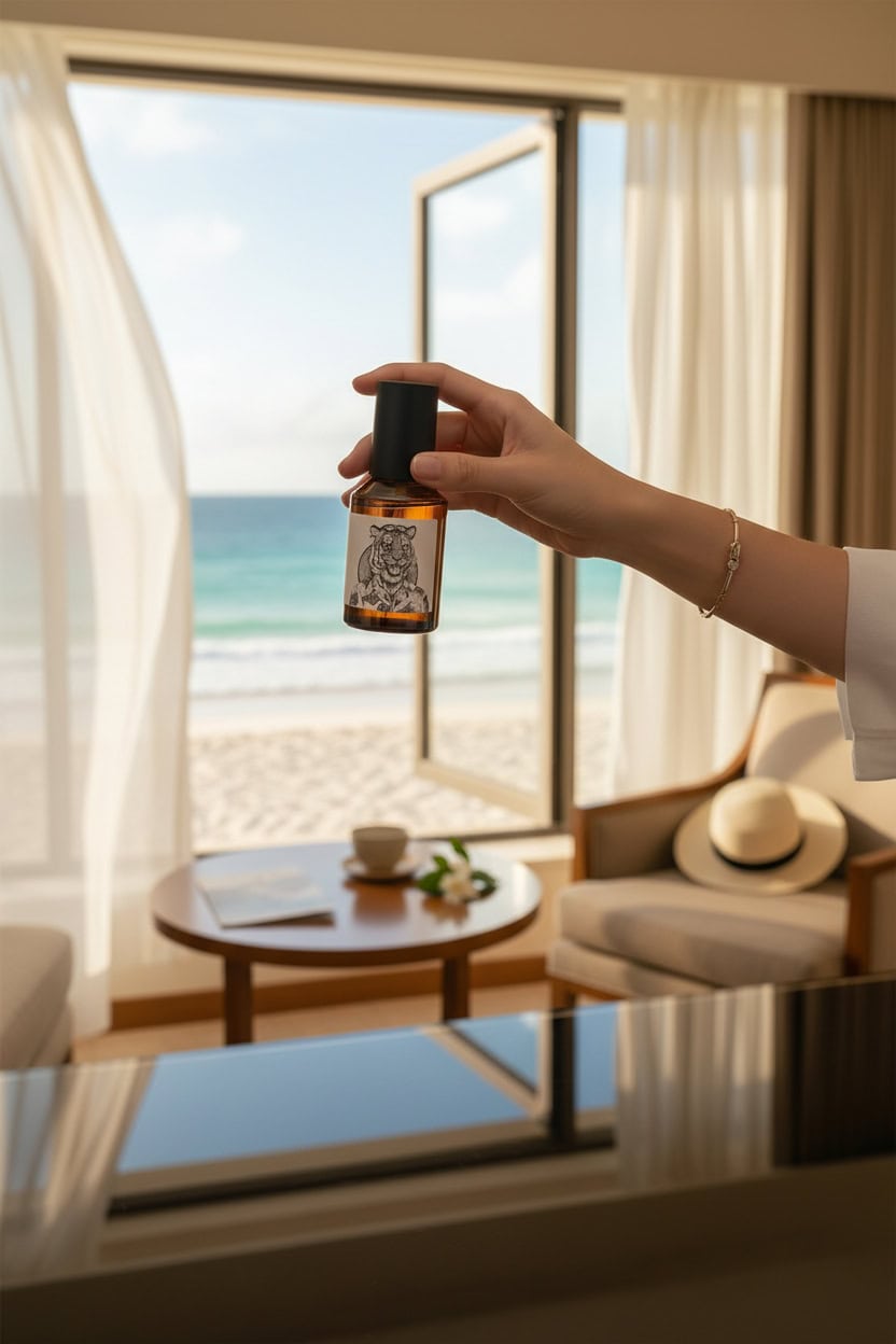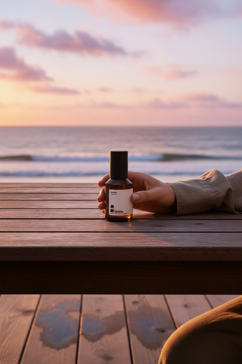 西西里橙和生薑的組合,帶有一種跳動的氣泡感,像極了海面上金黃色的晨光。黑茶的沉靜與橙花的純粹相互包裹,呈現出冰鎮茶飲般的透涼感。最後,癒創木的木質香氣慢慢散開,像是在躺椅上,一邊聽著海浪,一邊沉浸在最舒服、最慵懶的放鬆時刻。